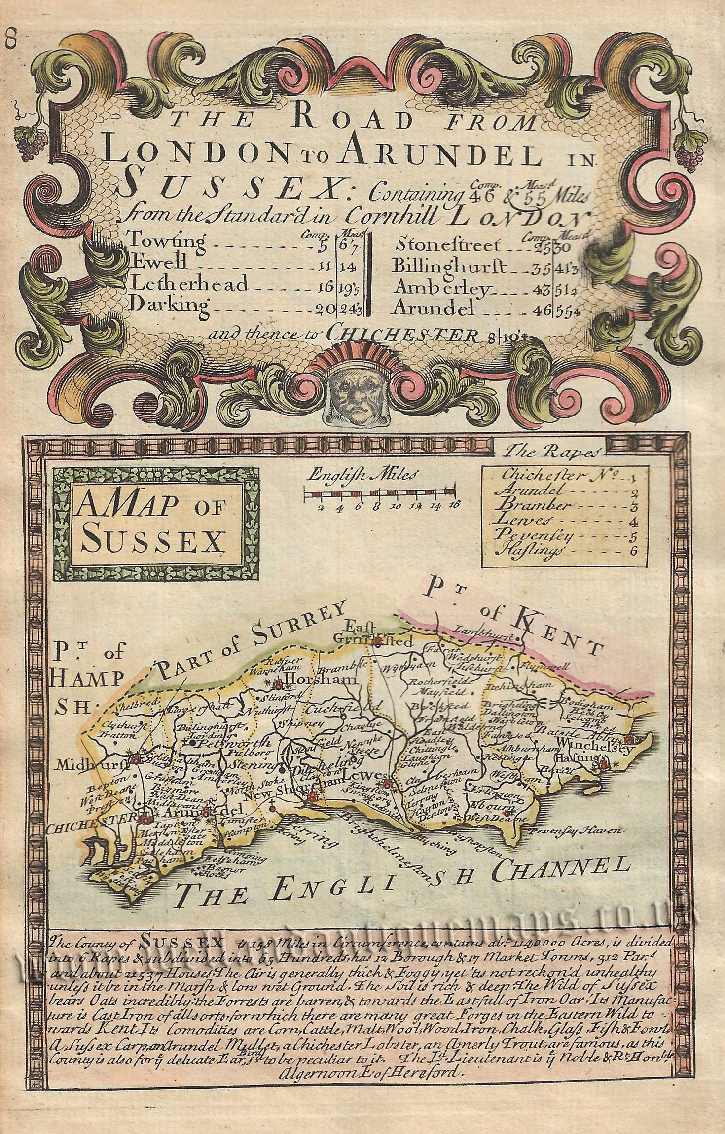 A charming 18th Century map of Sussex which appeared in Owen & Bowen’s pocket road atlas, Britannia Depicta or Ogilby Improv’d (London: T. Bowles, 1720).