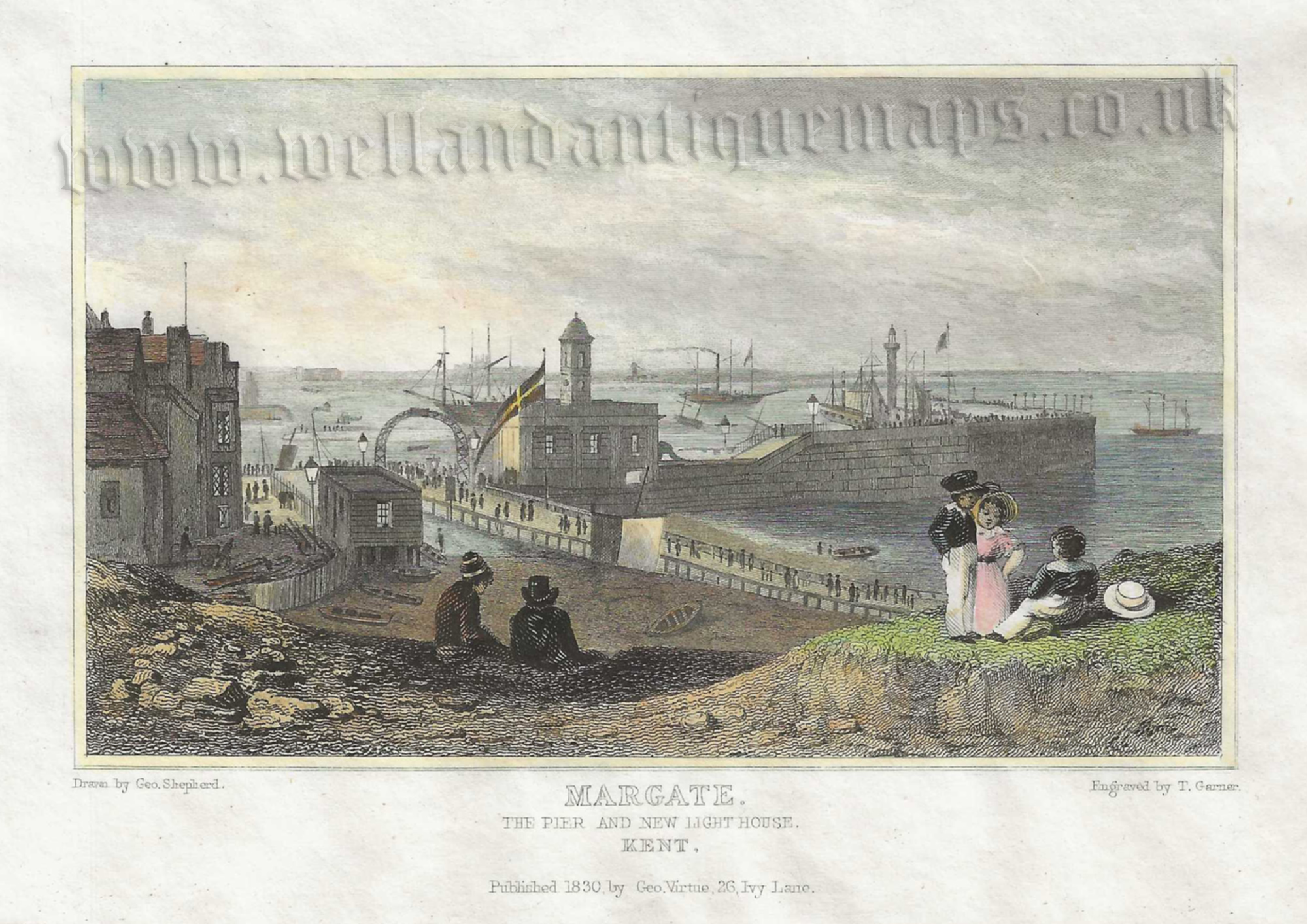 An interesting and attractive 19th century view of Margate Pier and Lighthouse, Kent which was drawn and engraved by George Shepherd and T. Garner, respectively, and published in The Picturesque Beauties of Great Britain. Kent. (London: G. Virtue, 1830).