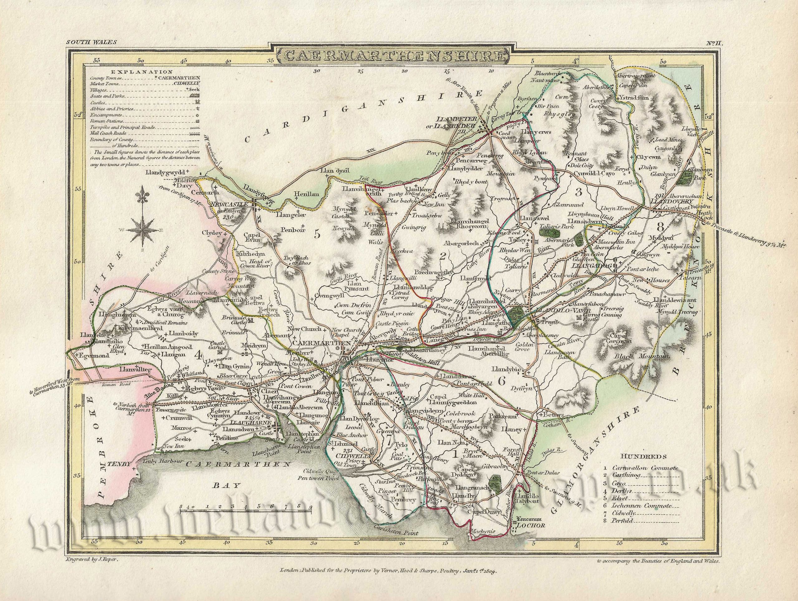 A detailed and attractive early 19th Century map of Caermarthenshire (Welsh: Sir Gaerfyrddin) which was drawn and engraved by G. Cole & J. Roper respectively and published in The British Atlas (London: Vernor, Hood & Sharpe, 1808-1810).