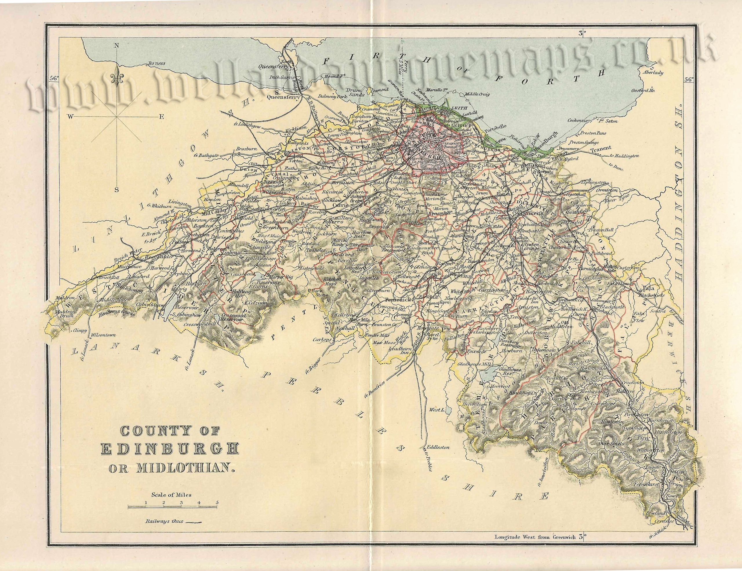 An interesting and detailed late 19th century map of Edinburghshire (or Midlothian), Scotland which was originally engraved by William Home Lizars and published in the Ordnance Gazetteer of Scotland (London, Edinburgh & Glasgow: William Mackenzie, [edited by Francis H. Groome] 1893).