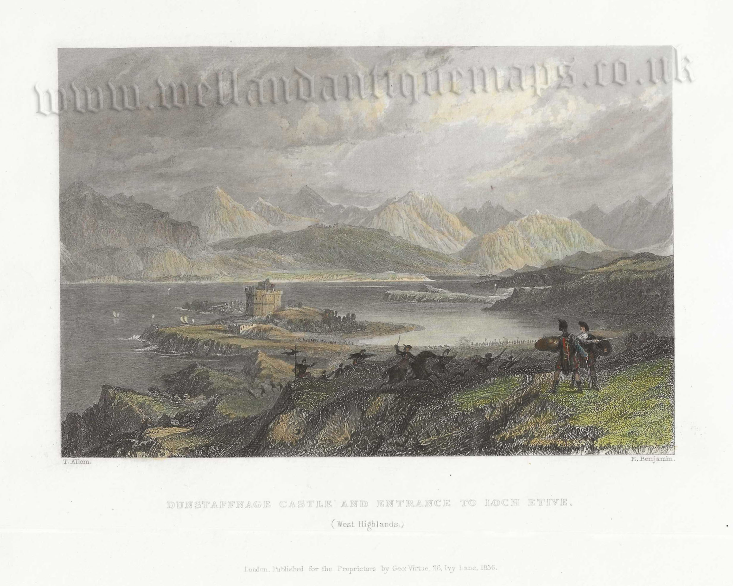 A very attractive 19th century view of Dunstaffnage Castle and Loch Etive, near Oban, Argyll & Bute, Scotland which was drawn and engraved by Thomas Allom and E. Benjamin, respectively, and published in William Beattie’s Scotland Illustrated (London: Geo Virtue, 1837).
