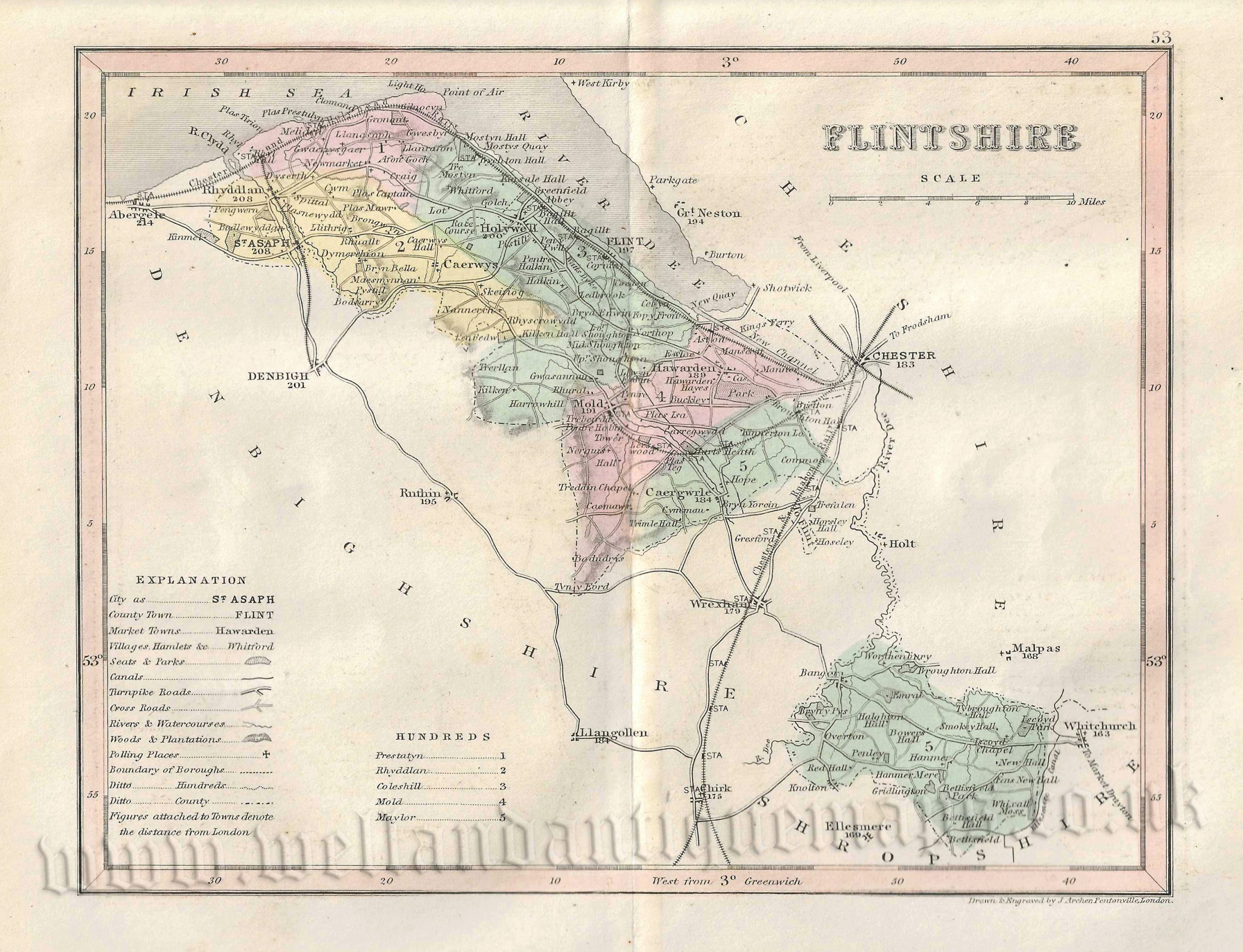 An attractive and detailed mid 19th century map of Flintshire which was drawn and engraved by Joshua Archer and published in Thomas Dugdale’s Curiosities of Great Britain. England and Wales Delineated (London: L. Tallis, 1855).