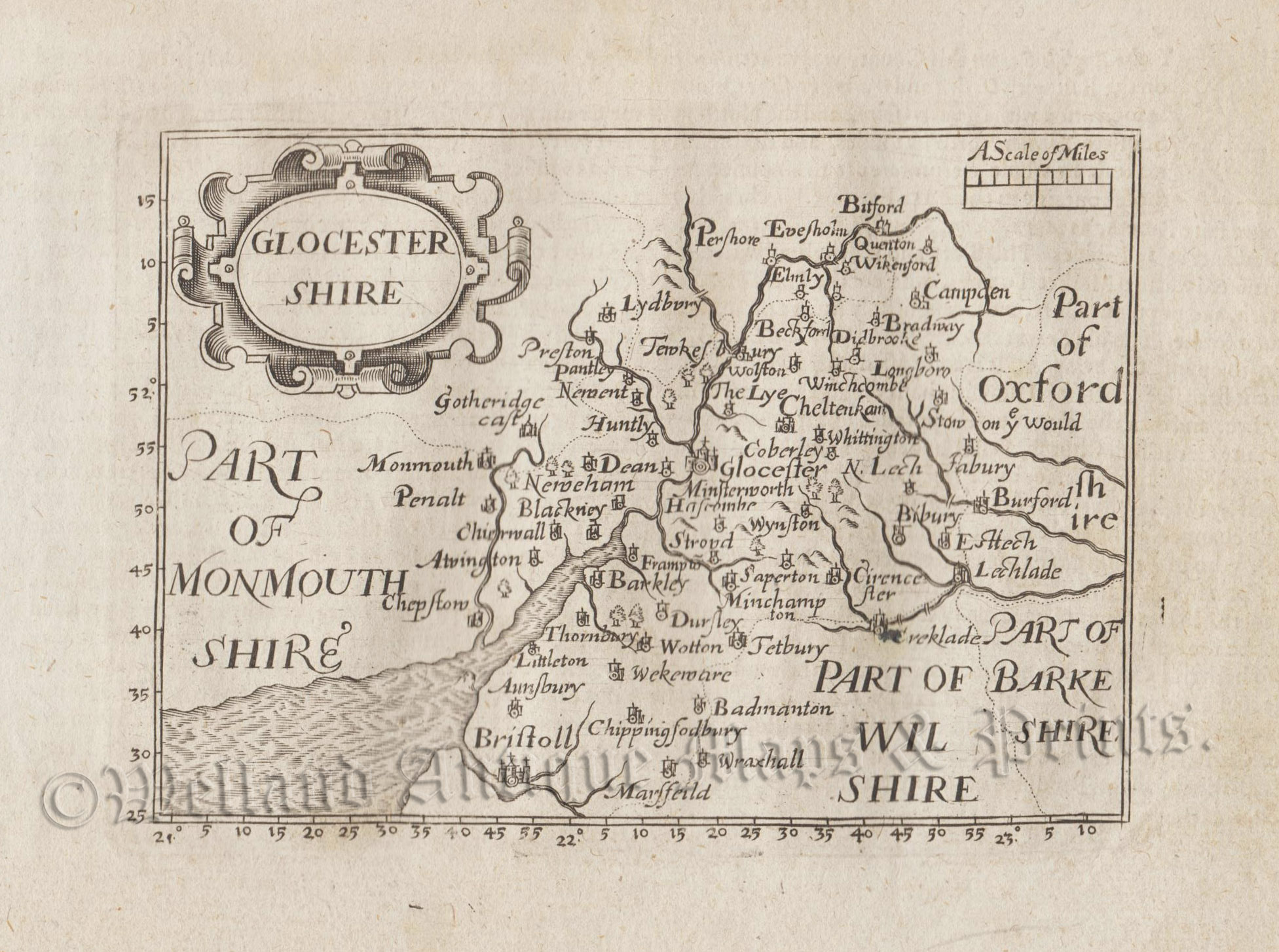 An attractive and extremely rare 17th century miniature map of Gloucestershire which was published in John Bill’s The Abridgement of Camden’s Britania…’ (London: J. Bill,1626).