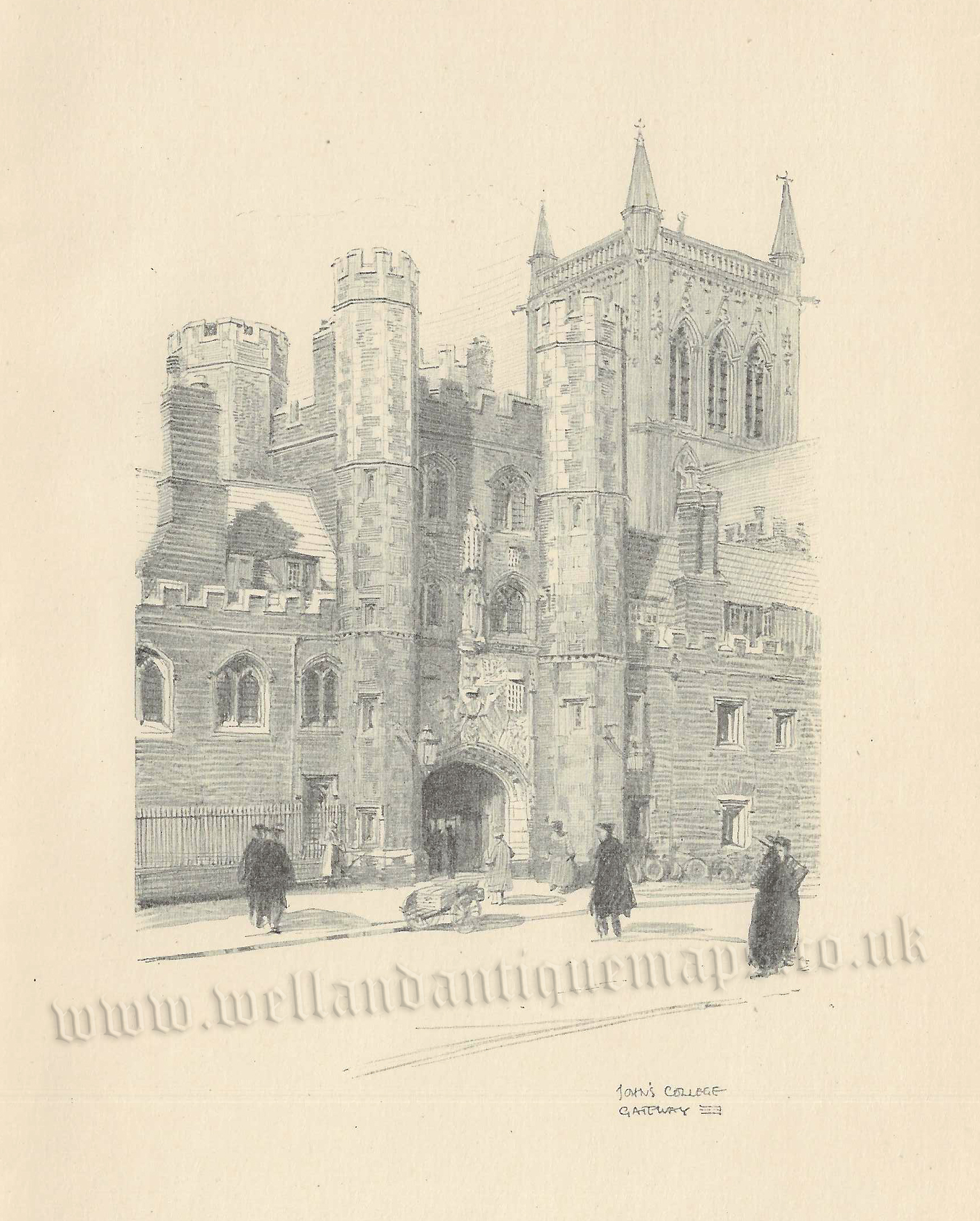 A very attractive early 20th century view of St. John’s College Gateway, Cambridge which was taken from an original sketch and published in Cambridge A Sketch-Book By Walter M. Keesey (London: A. & C. Black, 1913-1926).