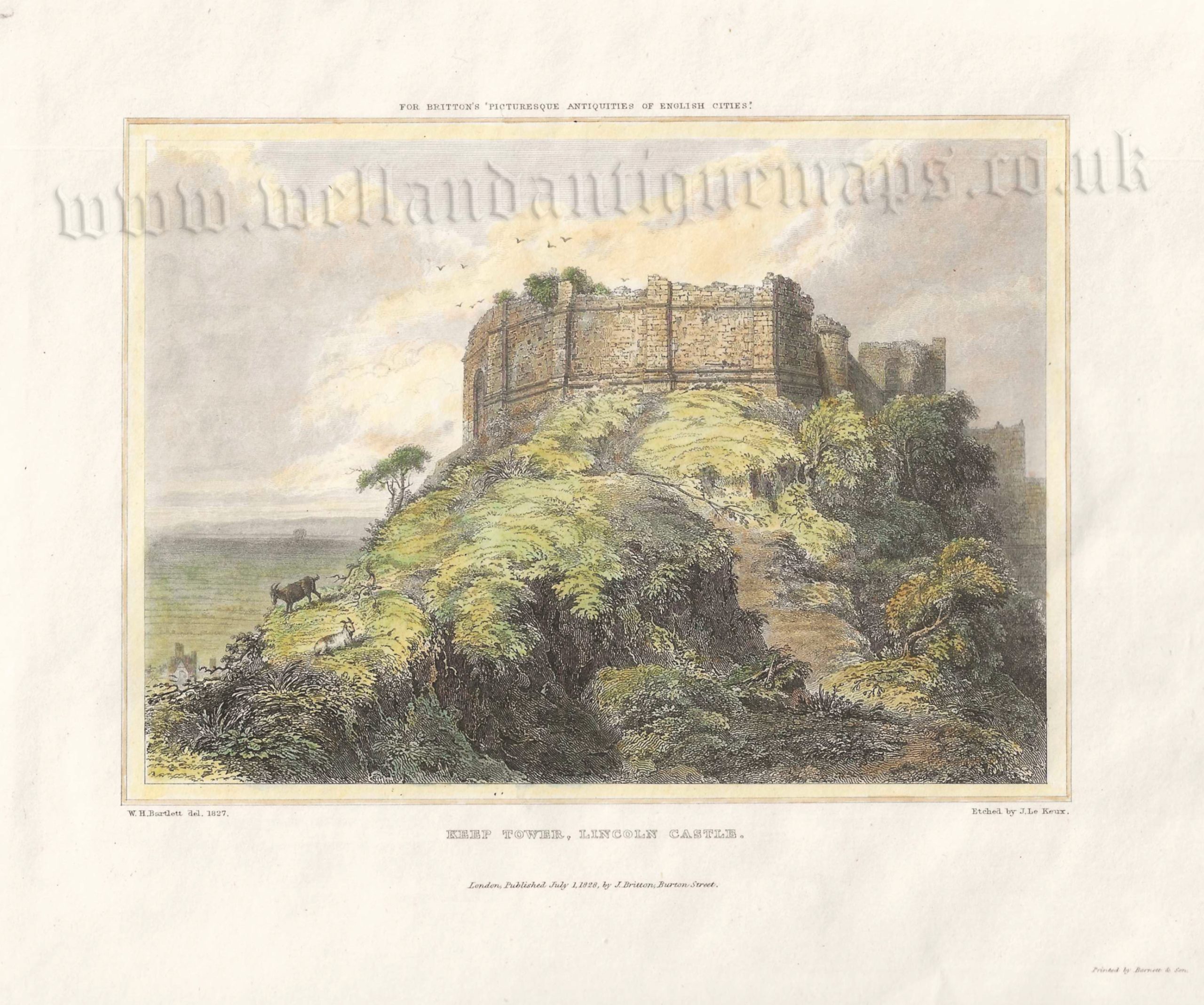 A very attractive 19th century view of the Keep Tower, Lincoln Castle, Lincoln which was drawn and engraved by William Henry Bartlett and John Le Keux, respectively, and published in John Britton’s Picturesque Antiquities of English Cities. (London: J. Britton, 1828-1830).