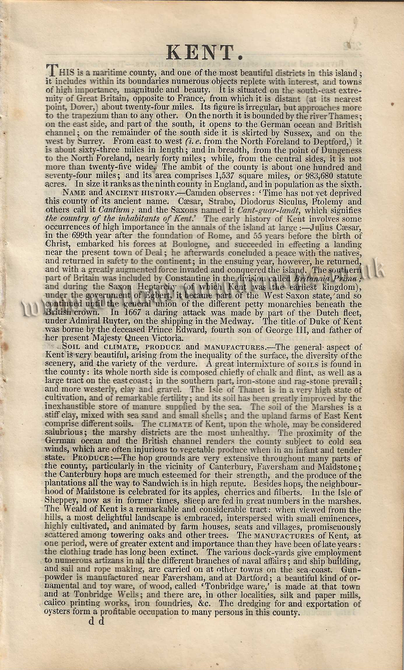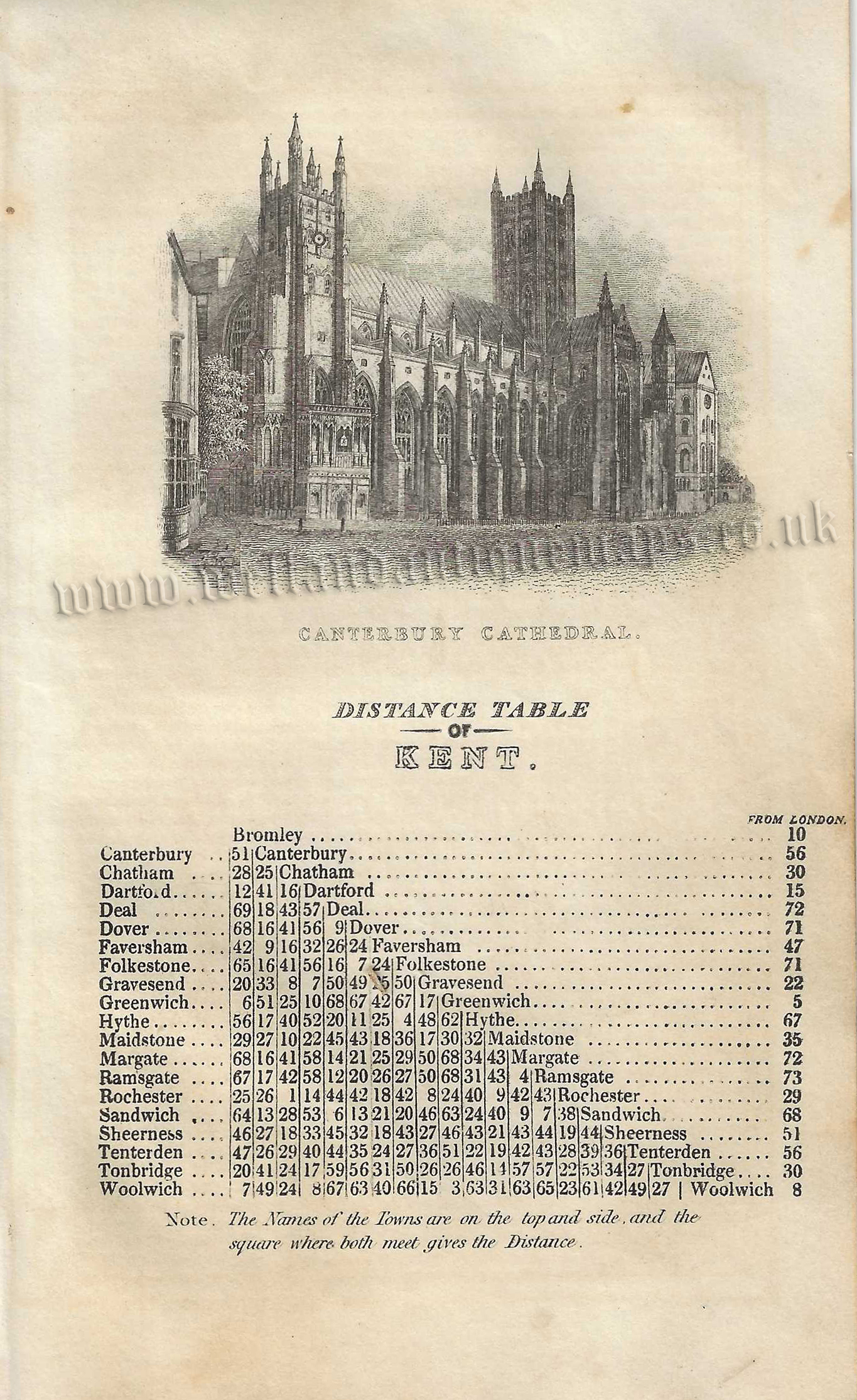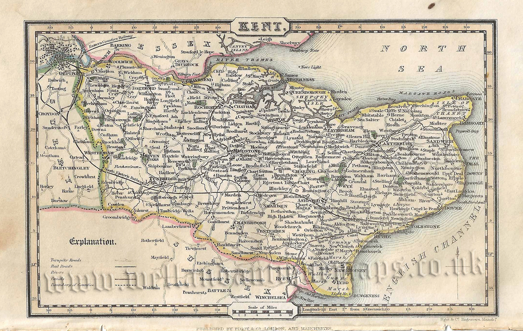 An attractive and detailed mid 19th century map and triangular distance table of Kent — with a vignette view of Canterbury Cathedral — which was published by Pigot & co. in A Pocket Topography and Gazetteer of England (London & Manchester: 1841). The original pages of text which accompany the map and table are included in the purchase.
