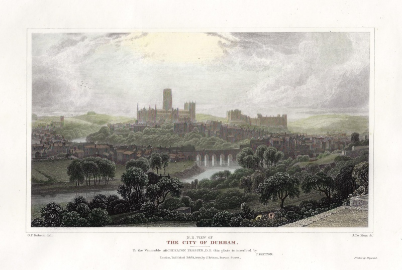 A very attractive and finely executed early 19th century view of the City of Durham from the north-east which was drawn and engraved by George Fennel Robson and John Le Keux, respectively, and published in [G. F. Robson’s] Picturesque View of the English Cities (London: John Britton, 1828).