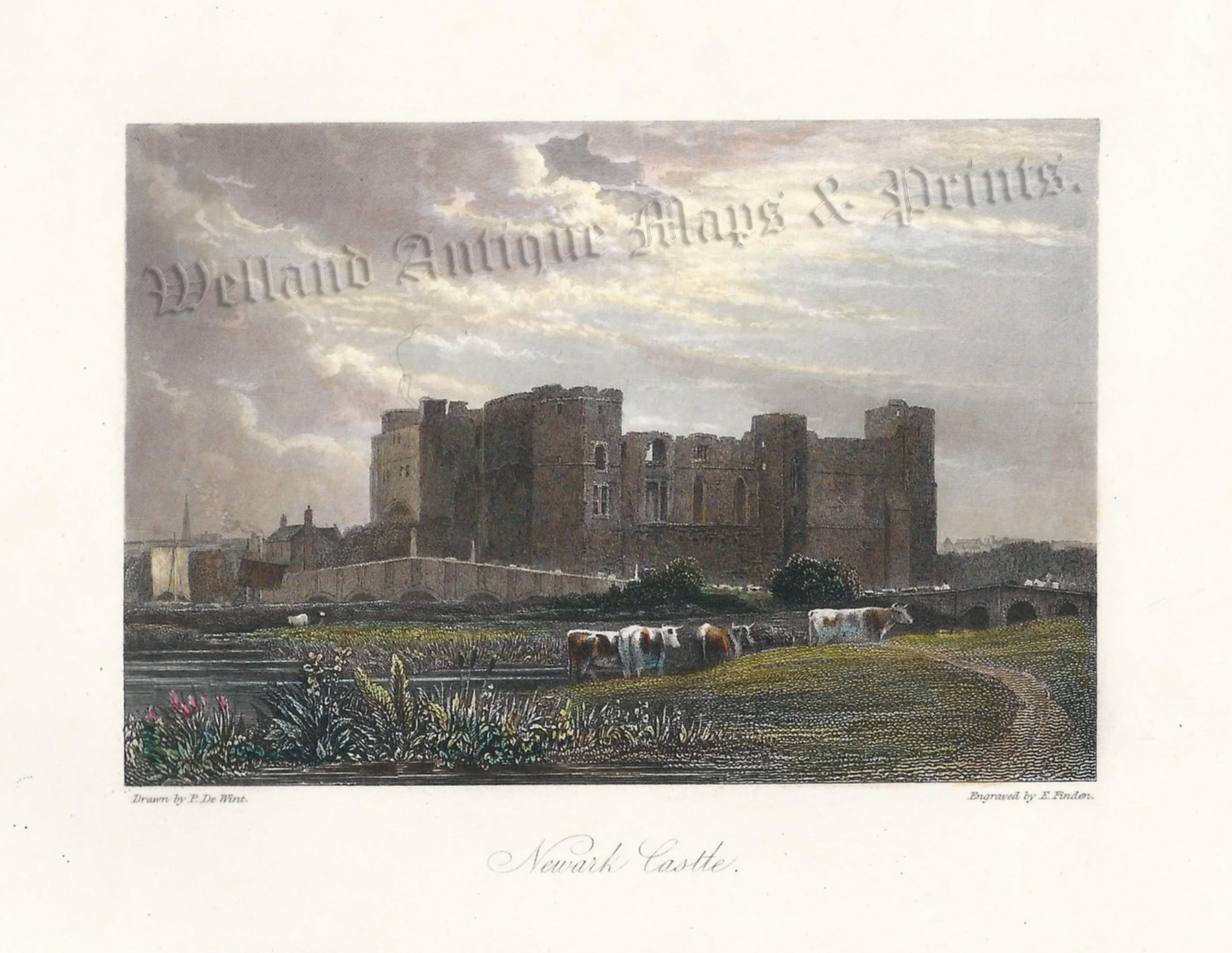 An attractive early 19th century view of Newark Castle, Nottinghamshire which was drawn and engraved by P. De Wint and E. Finden, respectively, and published in London by Charles Tilt, (1830).