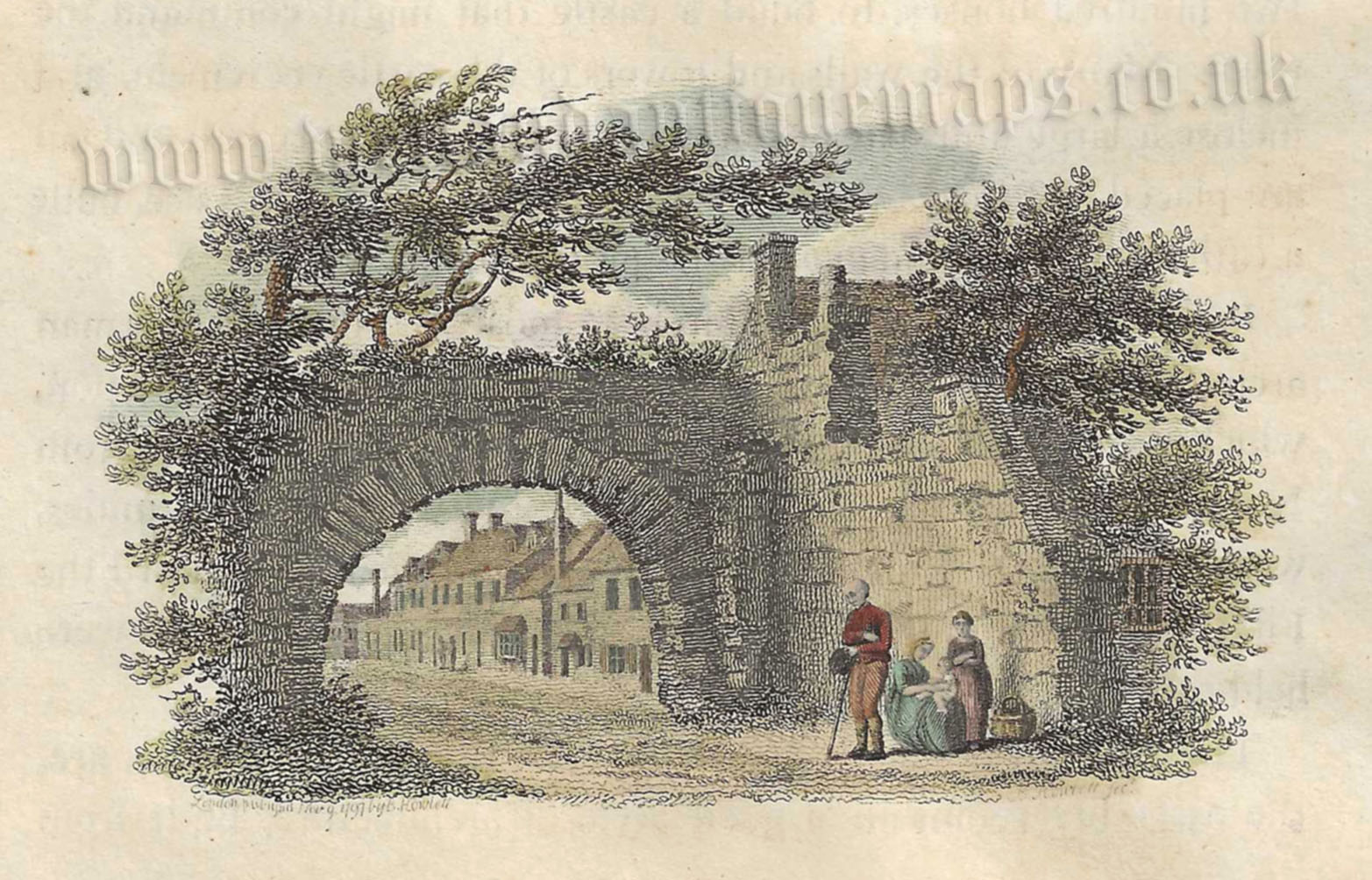 A finely engraved and picturesque early 19th century vignette view of Newport Arch in Lincoln, Lincolnshire which appeared in Bartholomew Howlett’s A Selection of Views in the County of Lincoln (London: W. Miller, 1801-1806).