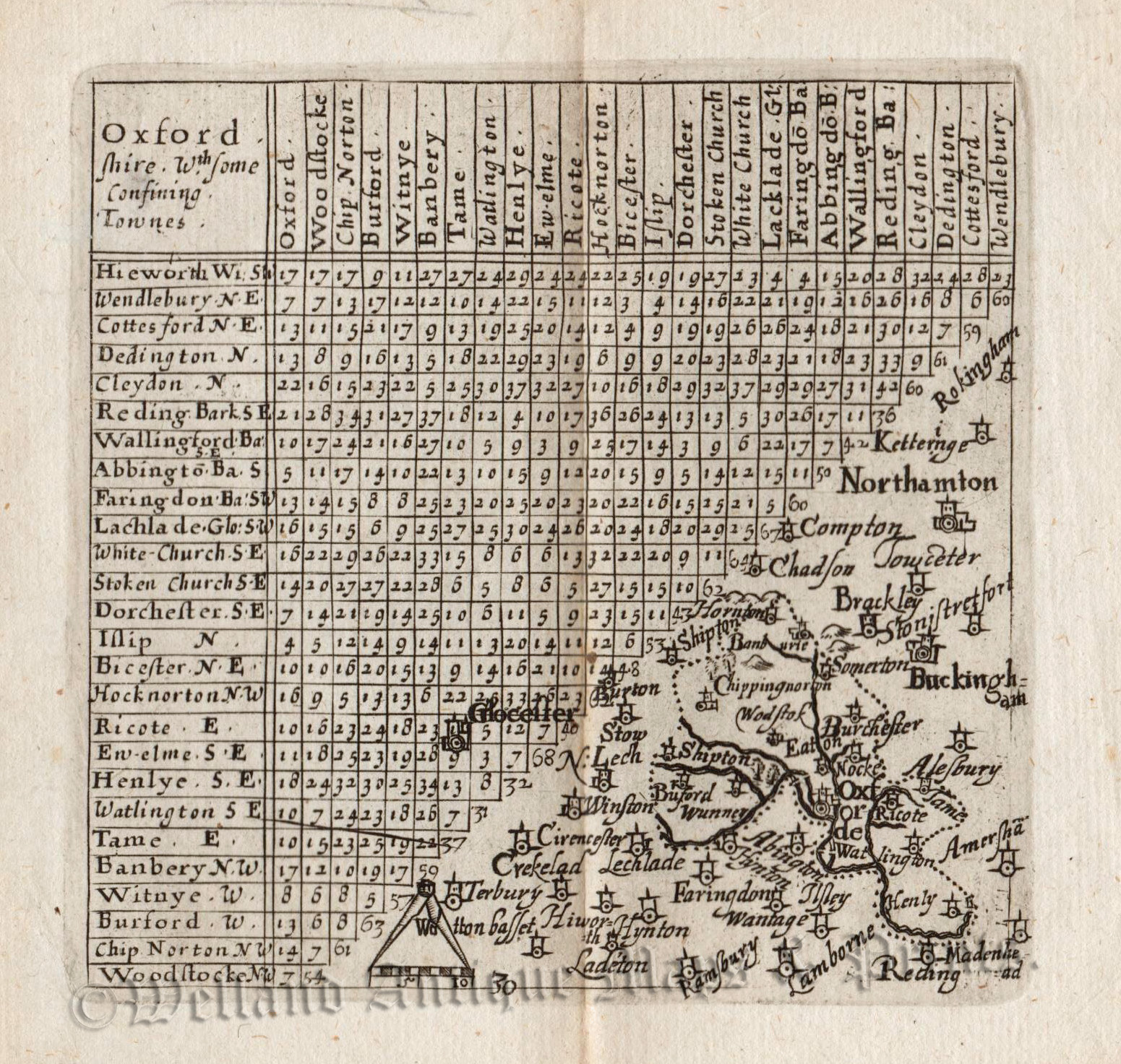 An interesting 17th century triangular distance table / miniature county map of Oxfordshire which was engraved by Jacob Van Langeren and published in A Direction for the English Traviller (London: T. Jenner, c.1643).