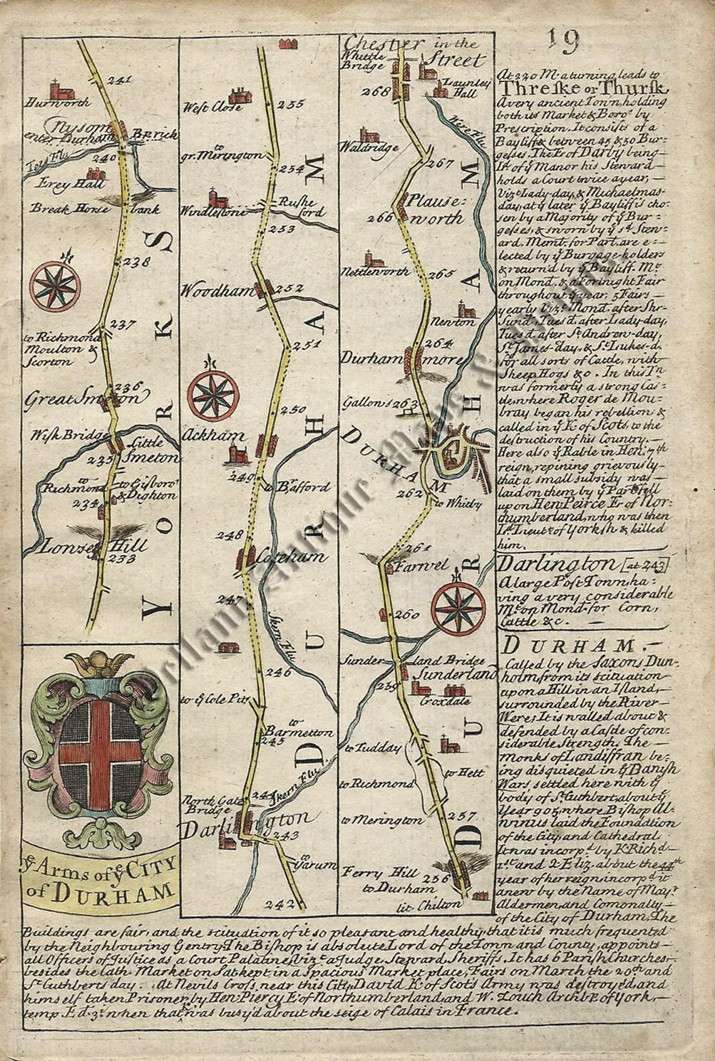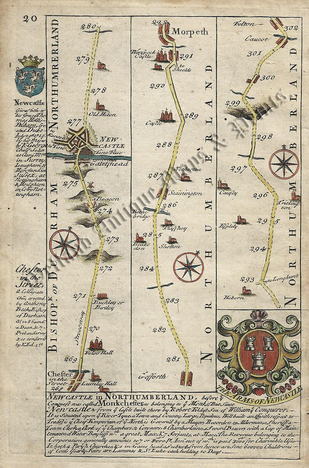 A charming, double sided 18th century road strip map showing the route from Darlington to Morpeth — via Durham, Chester-le-Street and Newcastle-upon-Tyne — which appeared in John Owen and Emanuel Bowen’s Britannia Depicta or Ogilby Improv’d (London: T. Bowles,1720-c.1764).