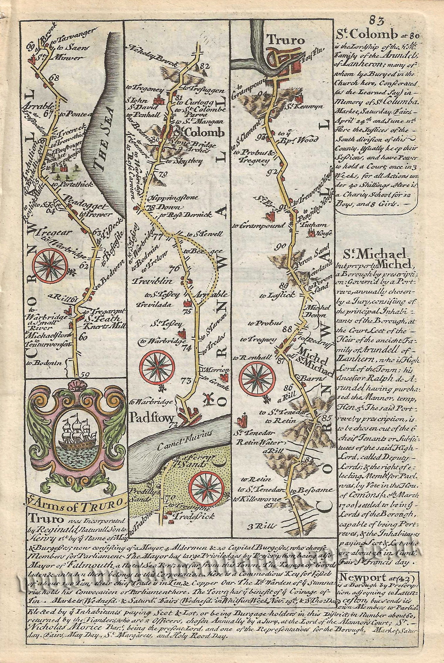 An interesting 18th century road strip map showing the route from Padstow to Truro — via St. Columb and Mitchell (St. Michael’s) which appeared in John Owen & Emanuel Bowen’s Britannia Depicta or Ogilby Improv’d (London: T. Bowles, 1720-c.1764).
