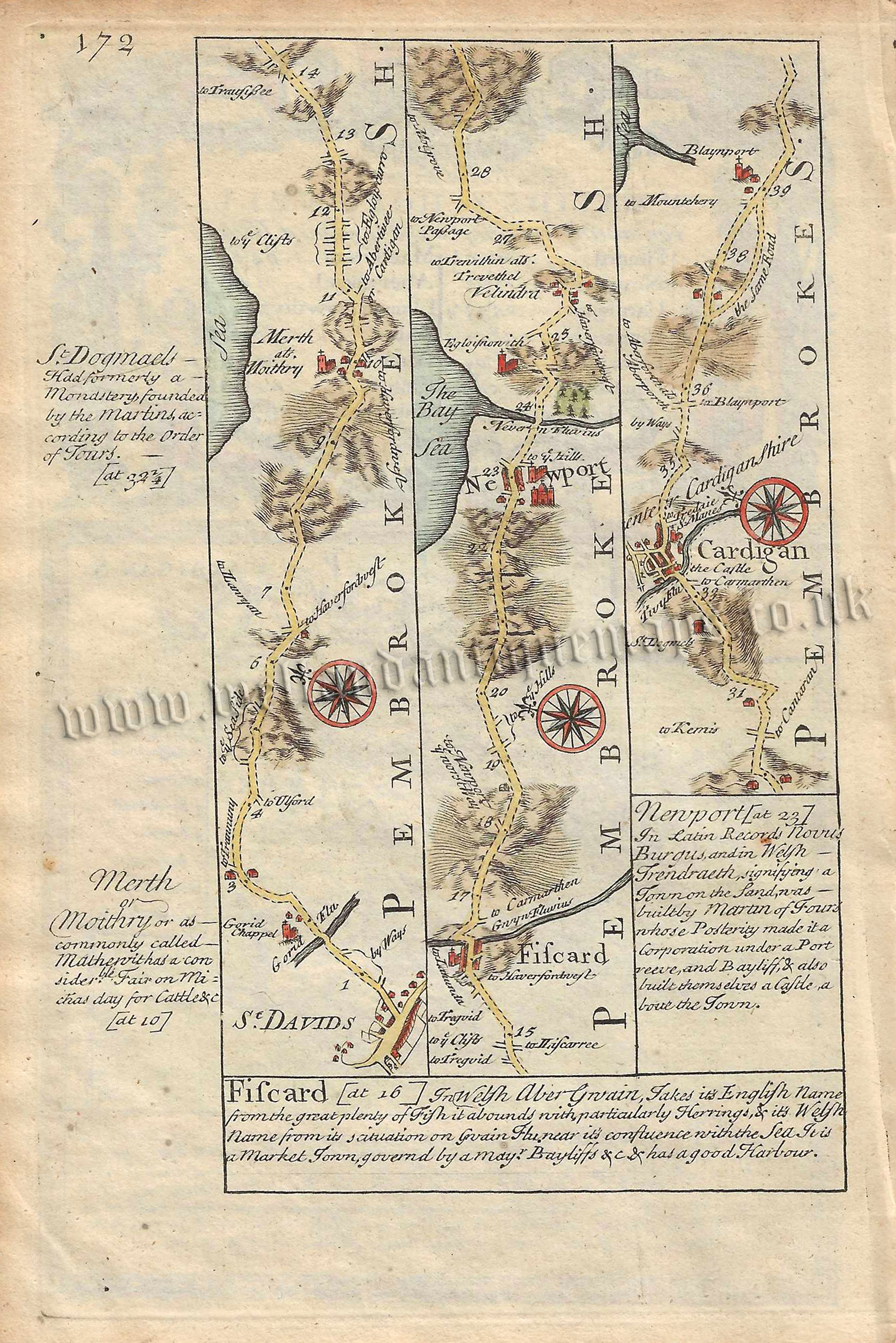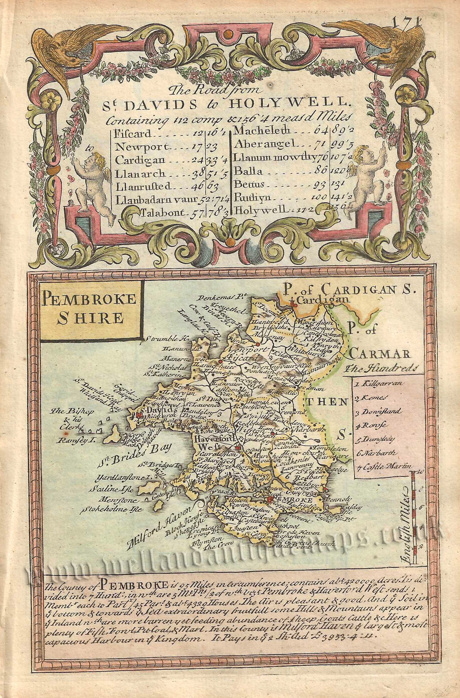 A charming 18th Century map of Pembrokeshire which appeared in Owen & Bowen’s pocket road atlas, Britannia Depicta or Ogilby Improv’d (London: T. Bowles, 1724). This map is double sided, showing the road from St. David’s to Cardigan — via Fishguard and Newport — on the reverse.