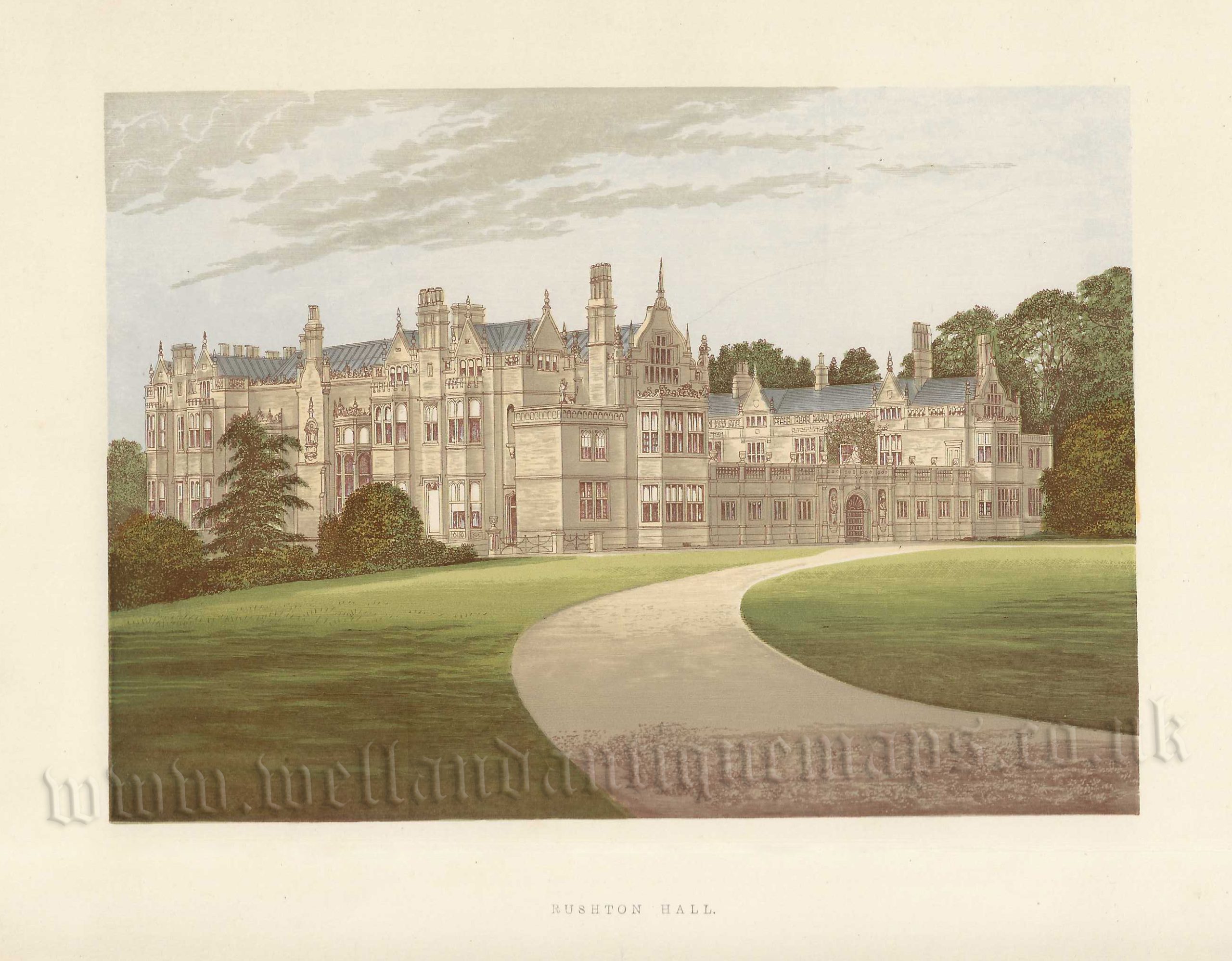 A very attractive late 19th century view of Rushton Hall, near Kettering, Northamptonshire which appeared in the Reverend F. O. Morris’s The County Seats of the Noblemen and Gentlemen of Great Britain and Ireland* (London: 1864-1880). The original page of text relating to the view is included.
