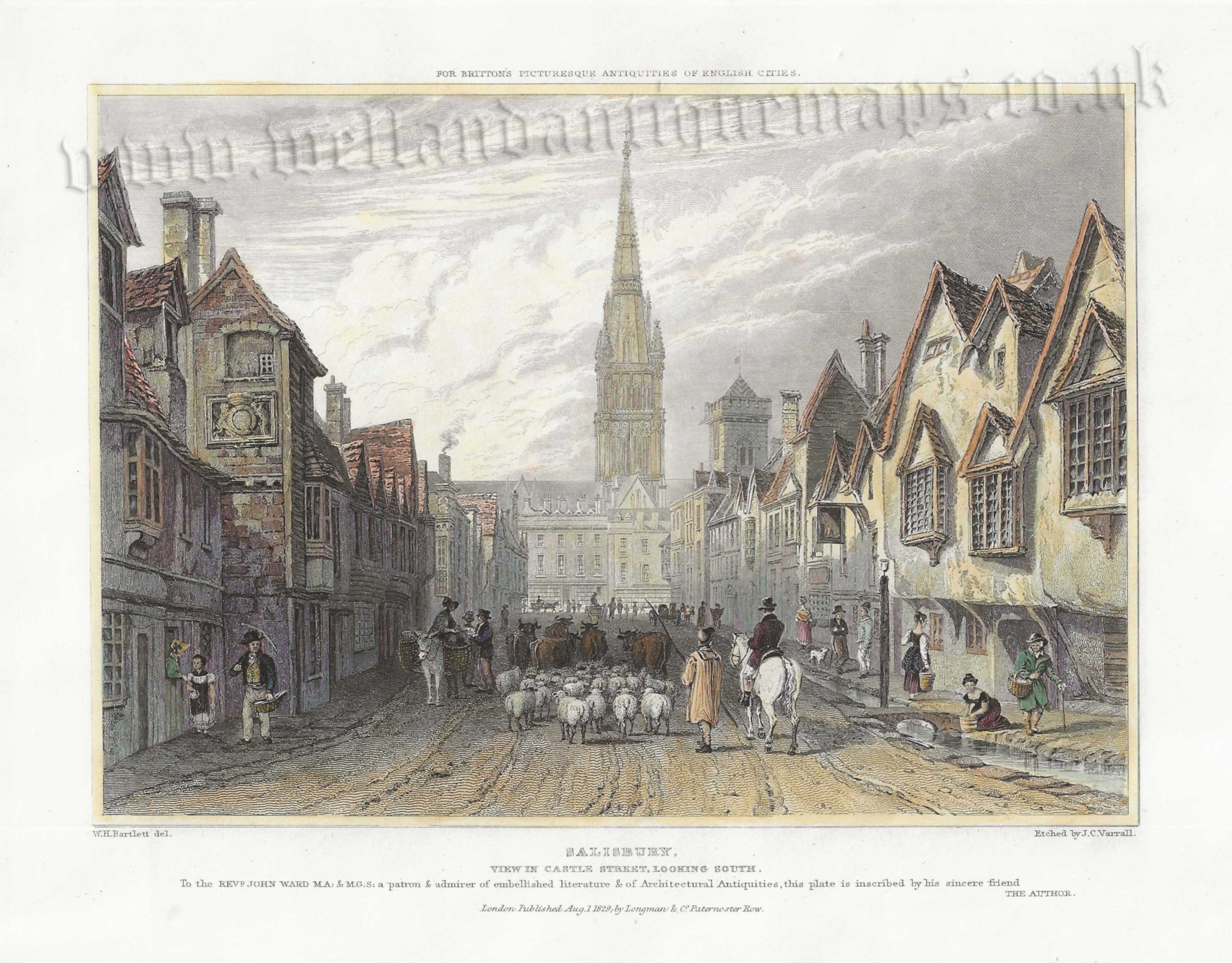 A very attractive 19th century view of Castle Street, Salisbury which was drawn and engraved by W.H. Bartlett and J. C. Varrall, respectively, and published in John Britton’s Picturesque Antiquities of English Cities (London: Longman & co, 1828-1830)