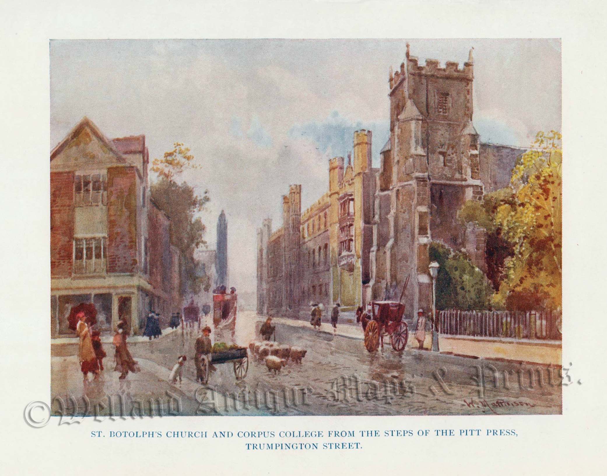 An attractive early 20th century process print of Trumpington Street, Cambridge — with St. Botolph’s Church, Corpus Christi College and the Pitt Press — which appeared in W. Matthison & M. A. R. Tuker’s Cambridge (London: A. & C. Black Ltd, 1907-1922).