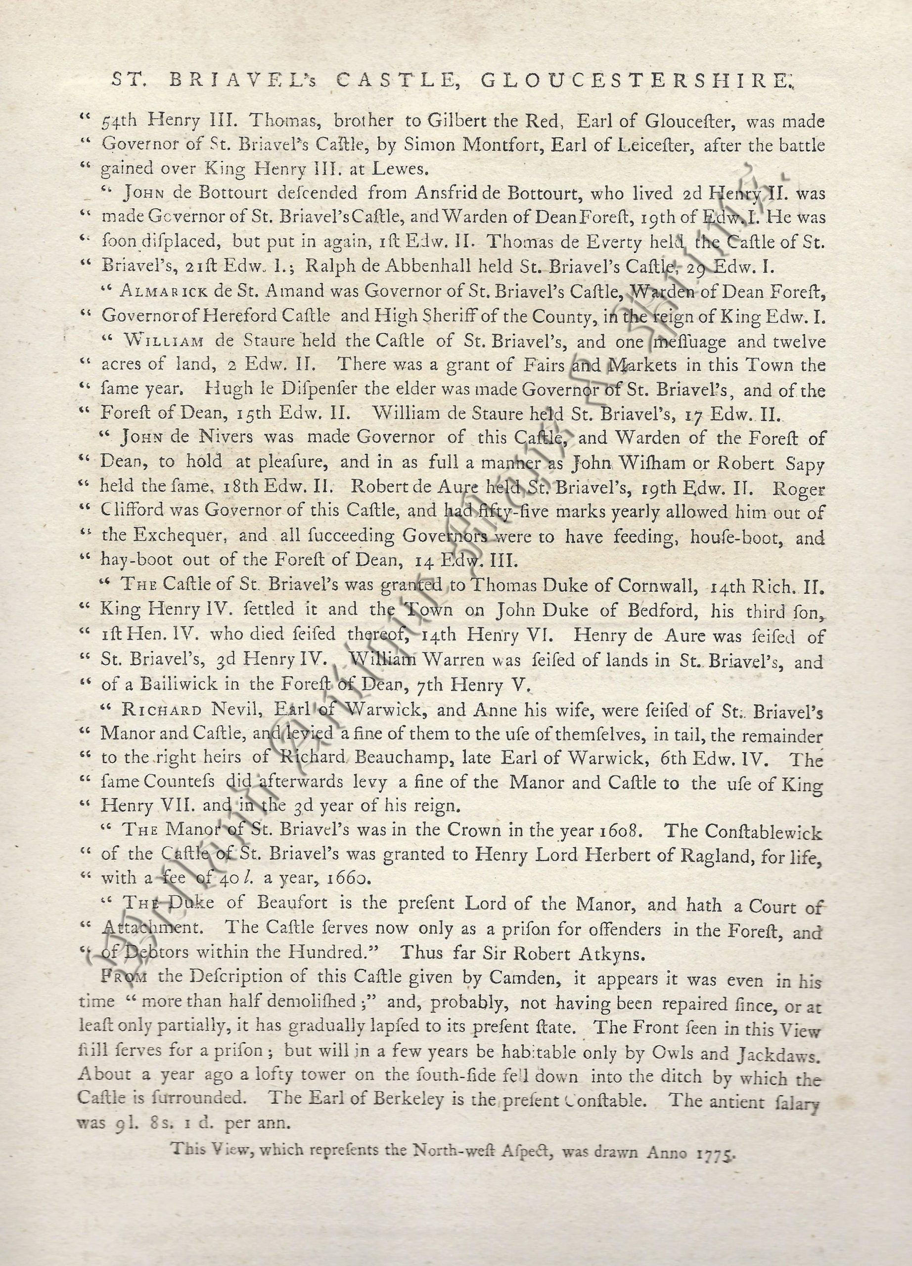 A charming and attractive late 18th century view of St. Briaval Castle, Gloucestershire — within a page of descriptive text — which was engraved by Sparrow and published in Francis Grose’s The Antiquities of England & Wales (London: S. Hooper, 1773-1787).