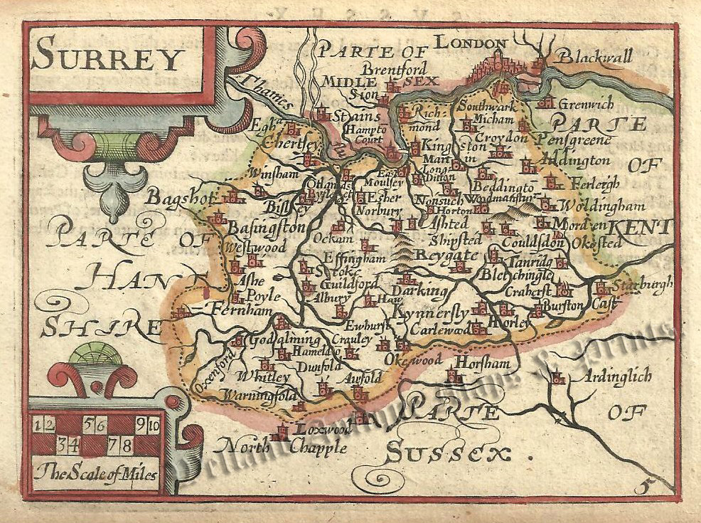 An interesting and attractive 17th century map of Surrey, based on the larger one done by John Speed (hence ‘miniature Speed’), which was published in England, Wales, Scotland and Ireland Described and Abridged… from a Farr Larger Voulume Done by John Speed (London: G. Humble, 1627/1676).Unlike many of the maps in the atlas, this was not engraved by Pieter Van Den Keere but is by an unknown (probably English) engraver.
