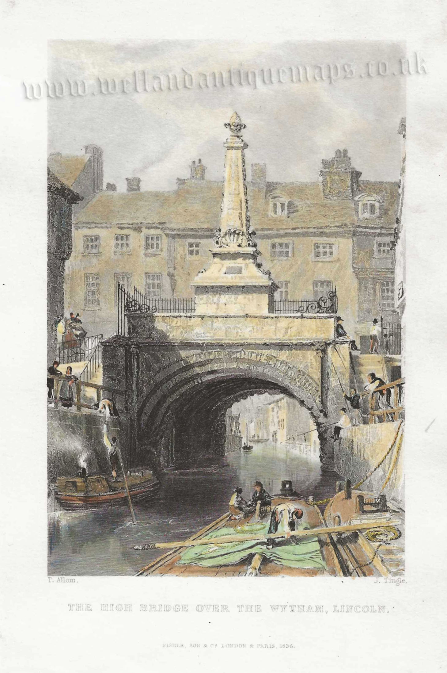 An interesting and attractive early 19th century view of the High Bridge*, Lincoln which was drawn and engraved by Thomas Allom and J. Tingle, respectively, and published in [Thomas Allom’s] The Counties of Chester, Derby, Nottingham, Leicester, Rutland, & Lincoln Illustrated. (London & Paris: Fisher & Son, c.1836).