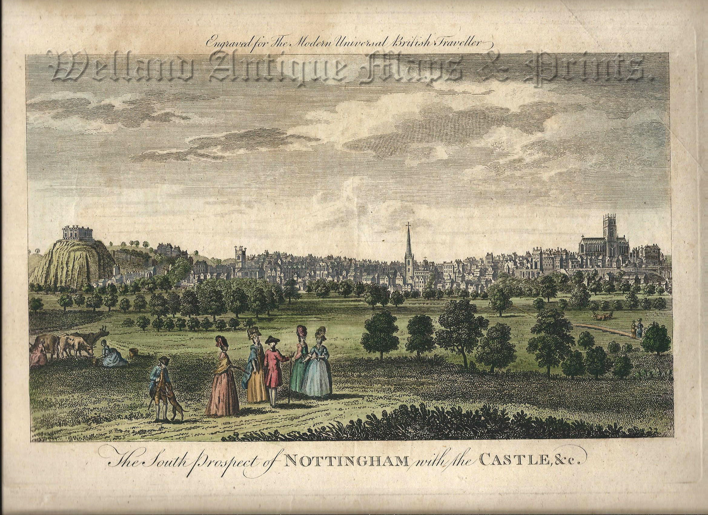 A charming and attractive late 18th century prospect view of the City of Nottingham which was published in The Modern Universal British Traveller (London: J. Cooke, 1779).