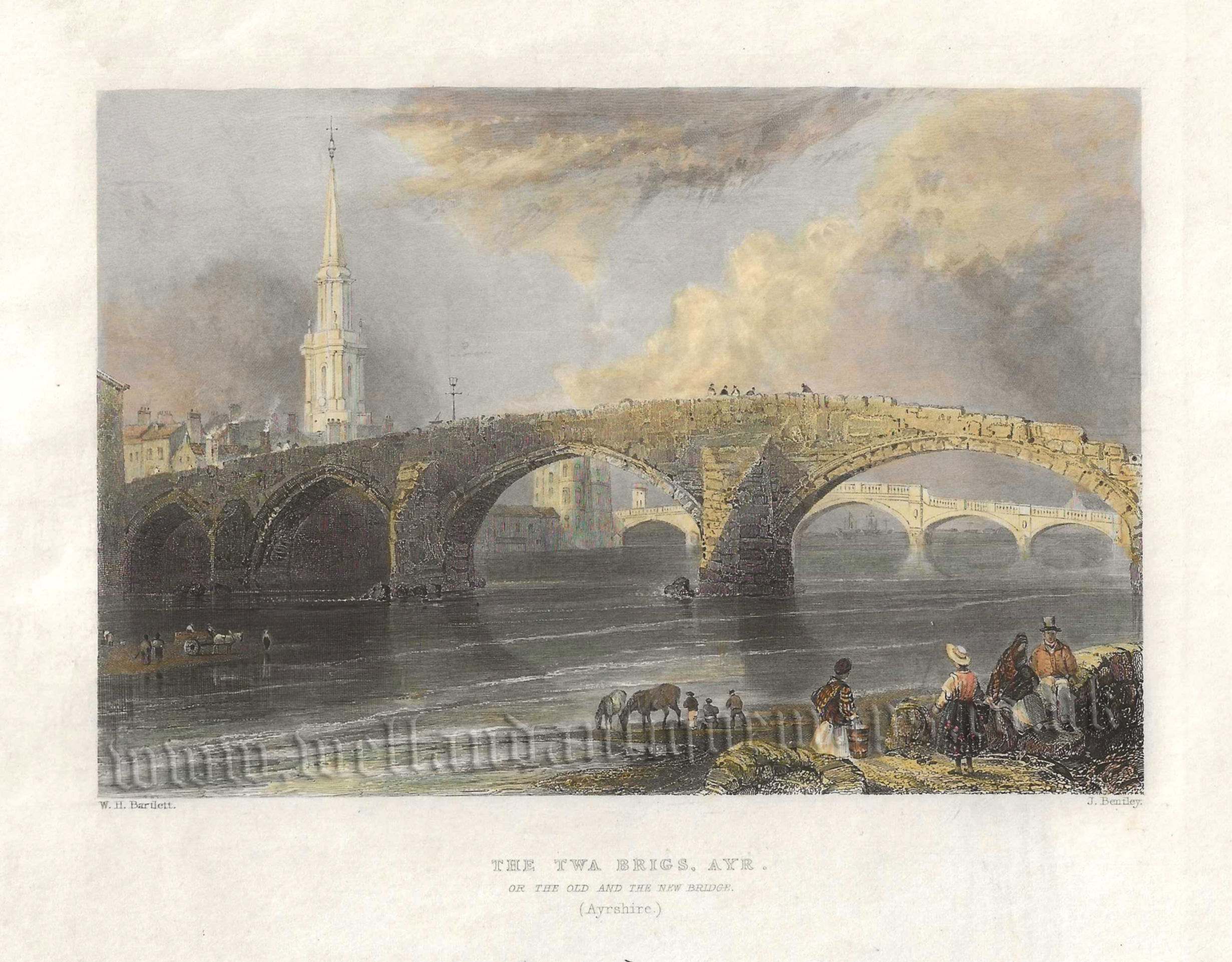 A very attractive 19th century view of the Twa Bridge in Ayr, Scotland which was drawn and engraved by W. H. Bartlett and J. Bentley, respectively, and published in William Beattie’s Scotland Illustrated (London: Geo Virtue, 1837-1841).