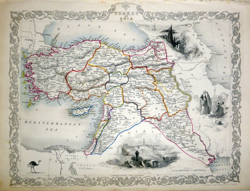 A highly decorative and finely engraved mid 19th century map of ‘Turkey in Asia’ (Middle Eastern part of the Ottoman Empire) which was engraved by J. Rapkin (vignettes by H. Warren & J. B. Allen) and published in John Tallis & co.’s The Illustrated Atlas (London & New York: c.1851)