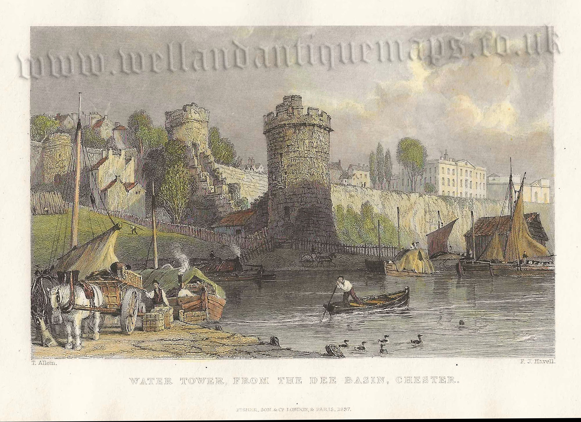 An attractive early 19th century view of the Water Tower, Chester which was drawn and engraved by Thomas Allom and F. J. Havell, respectively, and published in [Allom’s] The Counties of Chester, Derby, Nottingham, Leicester, Rutland, & Lincoln Illustrated. (London: Fisher & Son, 1836/37).